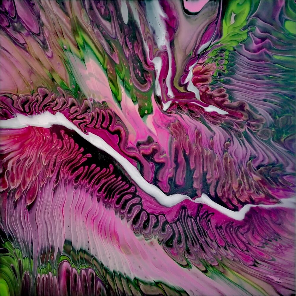 Acryl-Pouring bzw. Acrylgießen auf Leinwand, das Motiv setzt sich auf den Seitenflächen fort, Signatur auf Seitenfläche